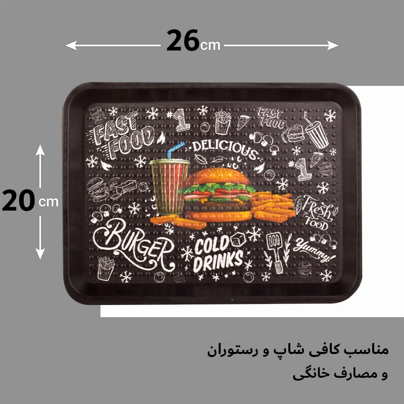 سینی **مهروز** طرح **Burger** دارای طراحی **مستطیلی** است که برای سرو انواع نوشیدنیها و خوراکیها مناسب است. ابعاد این سینی 20×26 سانتیمتر، فضای کافی برای قرار دادن فنجانهای قهوه، لیوانهای نوشیدنی، دسرها و غذاهای کوچک فراهم میآورد. طراحی مستطیلی این سینی علاوهبر استفاده بهینه از فضا، امکان جابهجایی آسان را فراهم میکند و برای استفاده در **مهمانیها** و **پذیراییها** بهویژه در محیطهای شلوغ مانند **کافهها** و **رستورانها** مناسب است.