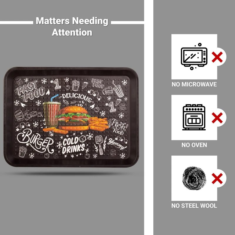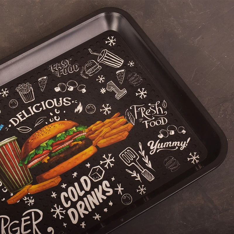 سینی **پلاستیک مهروز طرح Burger بهصورت بدون دستگیره طراحی شده است. این ویژگی به سینی ظاهری ساده و مینیمالیستی میدهد و حمل آن را آسانتر میکند. طراحی بدون دستگیره همچنین از هرگونه اضافات جلوگیری میکند و به سینی ظاهری شیک و مدرن میبخشد که برای هر نوع دکوراسیونی مناسب است.