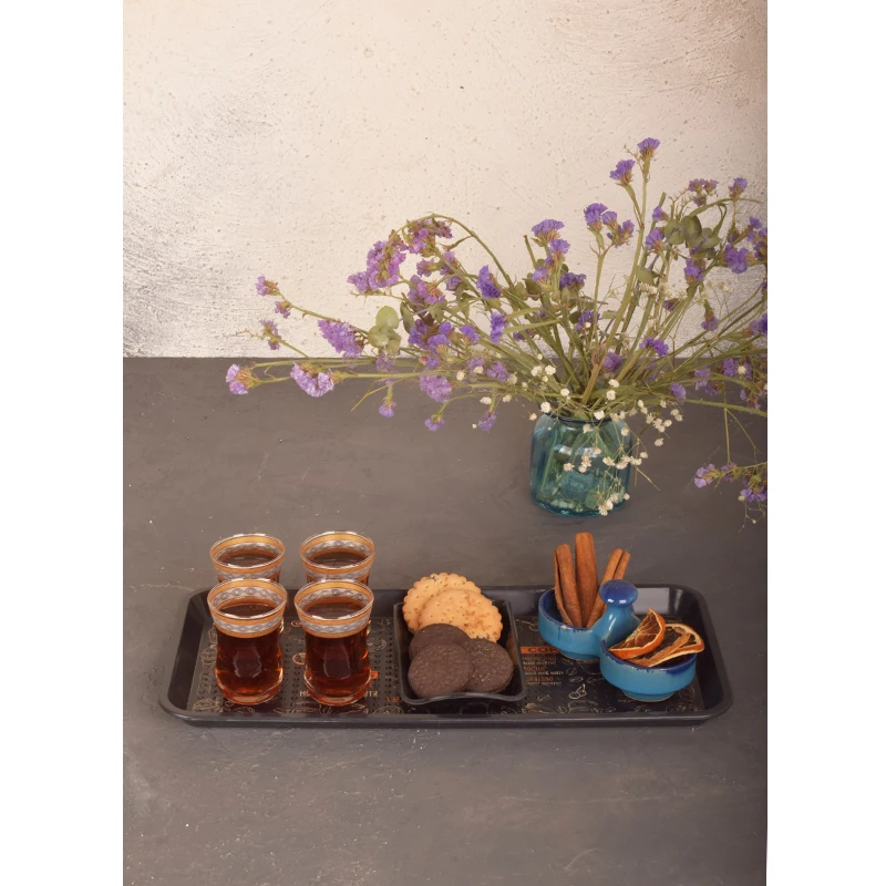 شکل این سینی مستطیل است؛ شکلی کلاسیک و پرکاربرد که فضای کافی برای قرار دادن لیوان‌ها، فنجان‌ها و حتی ظرف‌های کوچک شیرینی و دسر فراهم می‌کند. ابعاد 16×36 سانتی‌متر آن باعث می‌شود هم جمع‌وجور باشد و هم فضای کافی برای سرو نوشیدنی‌ها و خوراکی‌های متنوع داشته باشد.