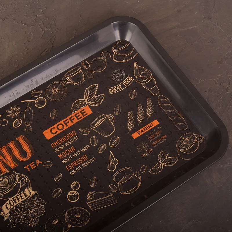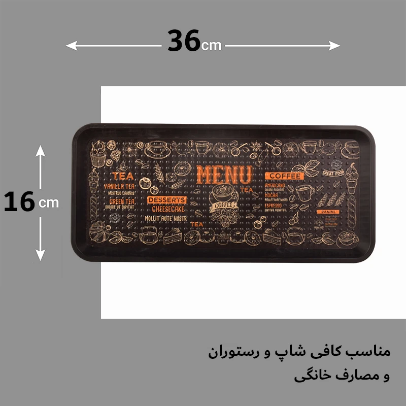 کافه و رستوران: در محیط‌های حرفه‌ای که سرعت عمل و زیبایی اهمیت زیادی دارد، این سینی می‌تواند کمک بزرگی باشد. ظاهر ساده و طرح منو روی آن، هماهنگی خاصی با فضای کافه‌ها و کافی‌شاپ‌ها ایجاد می‌کند.