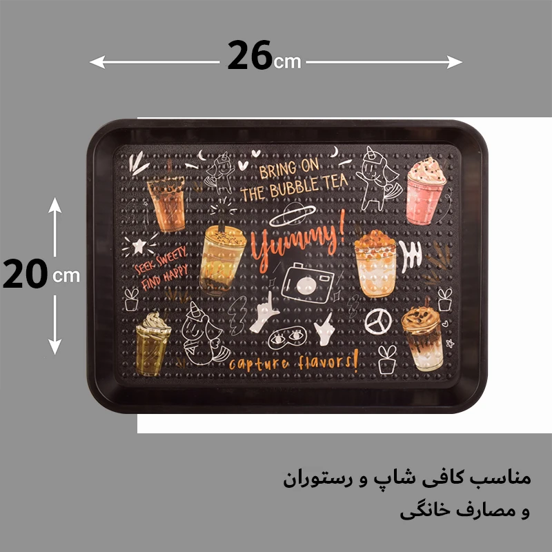 سینی پلاستیک مهروز طرح Yummy با ابعاد 26×20 سانتیمتر خود، برای سرو نوشیدنیها و خوراکیها طراحی شده است. این سینی فضای کافی برای قرار دادن انواع فنجانهای قهوه، لیوانهای چای، آبمیوه، دسرها، کیکها و سایر خوراکیهای کوچک فراهم میکند. طراحی مستطیلی این سینی همچنین باعث میشود که از فضای آن به بهترین نحو استفاده شود و شما بتوانید سرو نوشیدنیها و خوراکیها را بهراحتی انجام دهید.