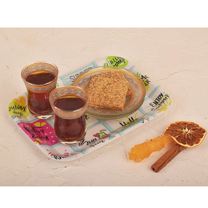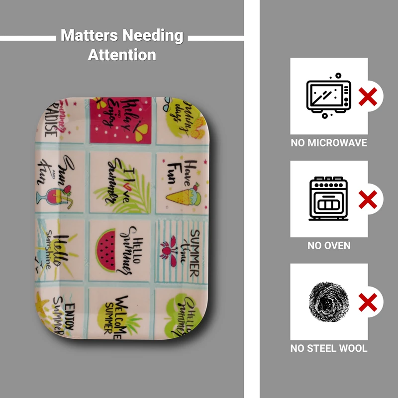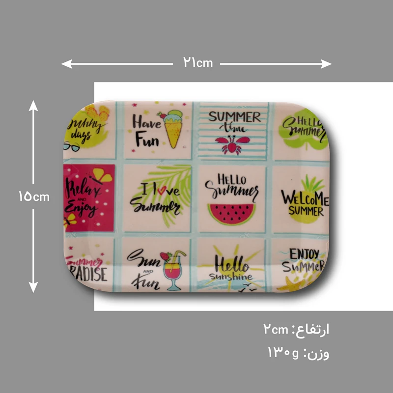 فرم مستطیلی سینی، در کنار این طرح شاد، تعادل خوبی ایجاد کرده است. نه بیش از حد فانتزی میشود و نه وارد فضای رسمی. نتیجه، محصولی است که هم در خانه کاربرد دارد و هم در محیطهایی که میخواهند فضای دوستانهتری ایجاد کنند.