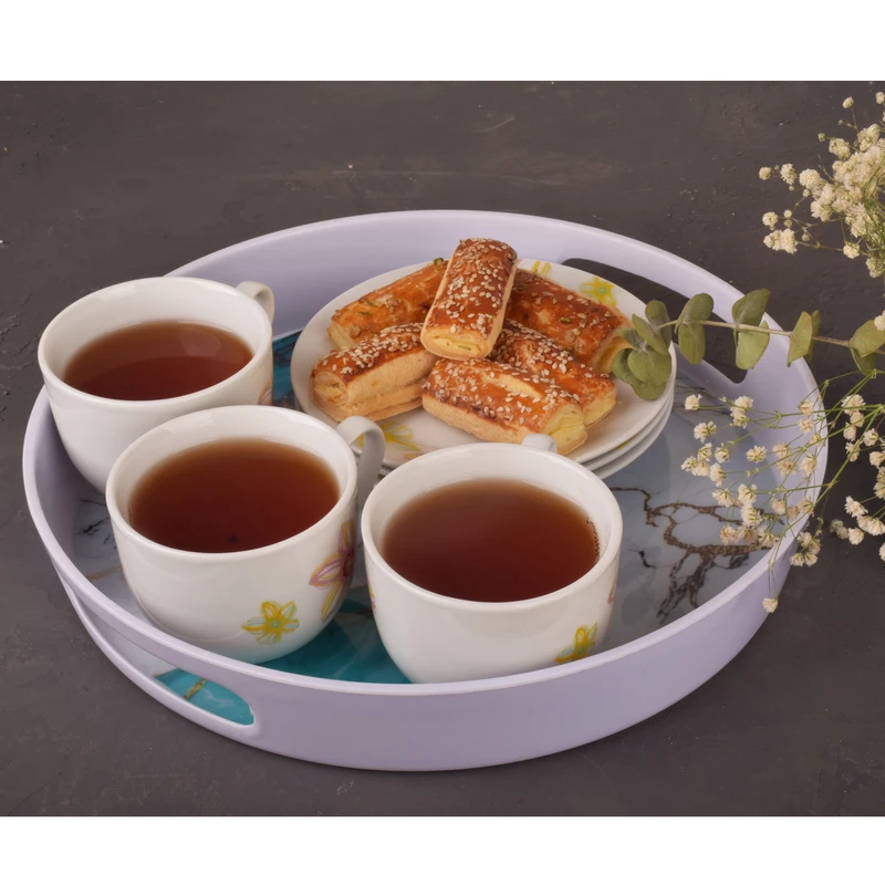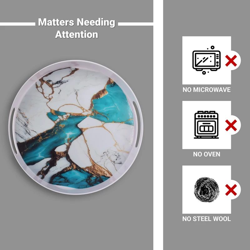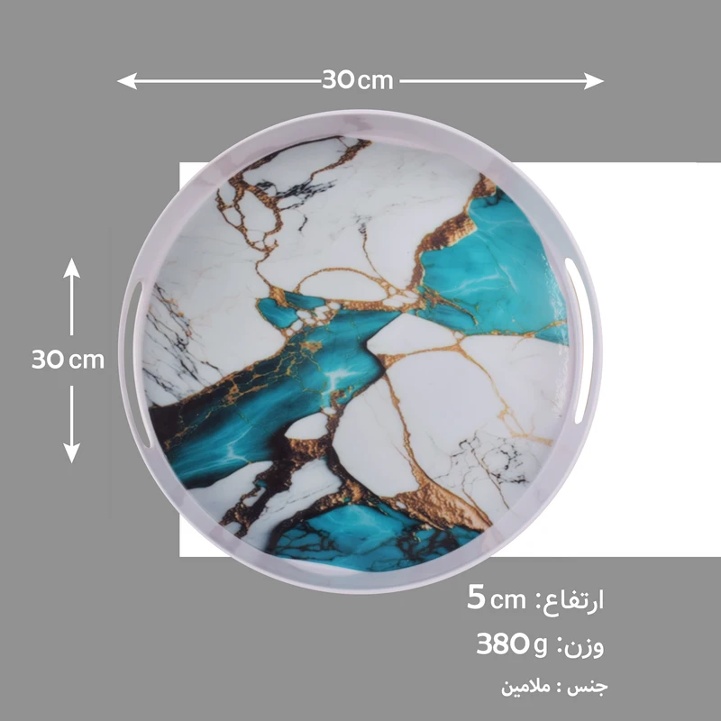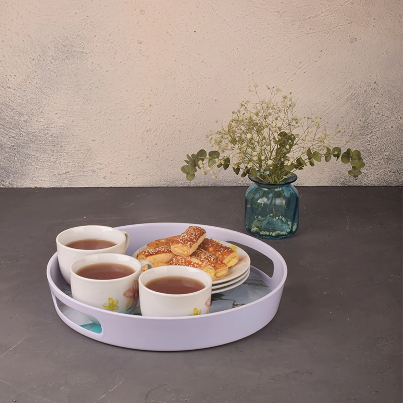 ملامین همچنین در برابر رطوبت، ضربههای سطحی و خطوخشهای معمول مقاومت خوبی دارد. به همین دلیل این سینی نهتنها برای استفاده تزئینی، بلکه برای پذیرایی واقعی و روزمره نیز کاملاً قابل اعتماد است. برخلاف برخی متریالهای سنگین یا شکننده، این مدل بدون نگرانی از آسیبدیدگی، بارها و بارها قابل استفاده است.