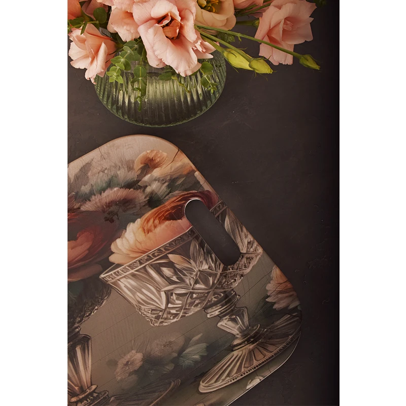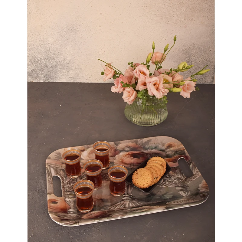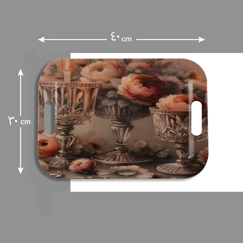 طرح گل رز بهکاررفته در این مدل، بهگونهای اجرا شده که نه بیش از حد کلاسیک است و نه کاملاً مدرن. همین تعادل باعث میشود این سینی در فضاهای مختلف، از آشپزخانههای ساده گرفته تا کافههای شیک و دکوراسیونهای خاص، جلوهای هماهنگ و چشمنواز داشته باشد.