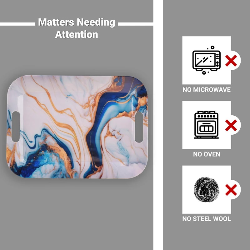 فرم مستطیلی این سینی، آن را به گزینهای کاربردی برای سرو انواع نوشیدنی و خوراکی تبدیل کرده است. این فرم به شما اجازه میدهد اقلام را با نظم بیشتری کنار هم قرار دهید و فضای سینی را بهطور کامل استفاده کنید.