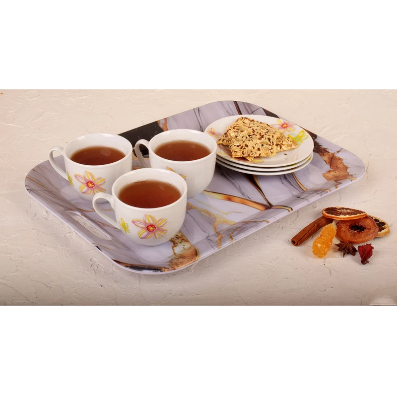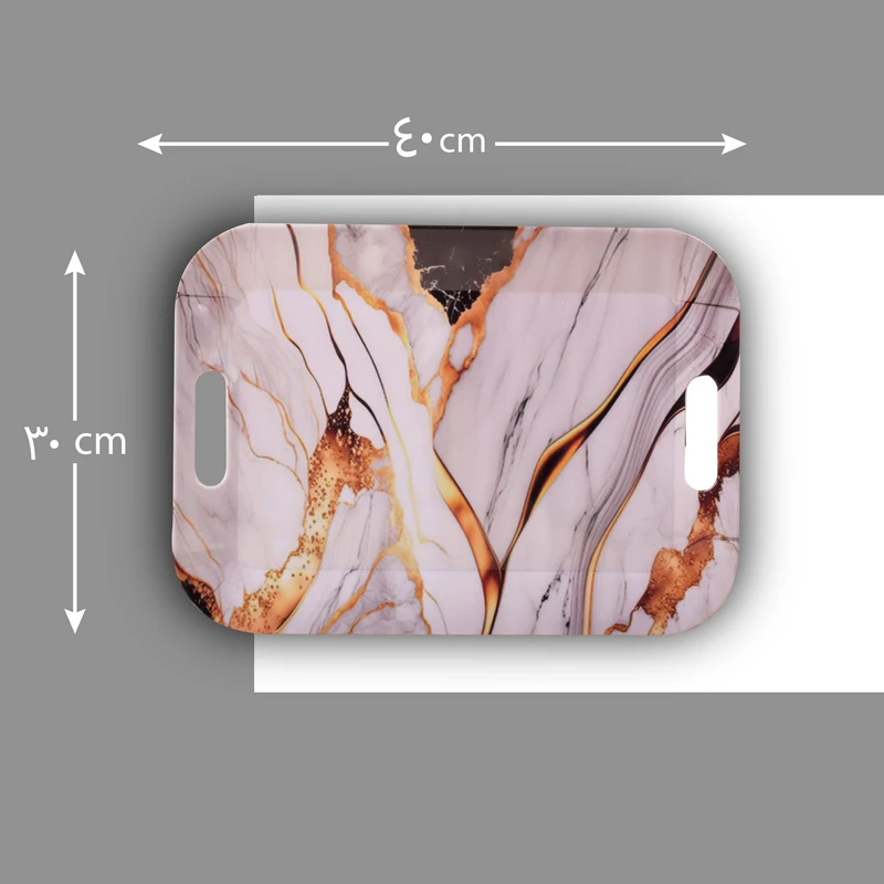 طرح مرمر بهکاررفته در این مدل، صرفاً یک نقش تزئینی نیست. این طرح با الهام از بافت سنگ مرمر، حس وقار و ثبات را به سینی منتقل میکند و باعث میشود حتی سادهترین سرو نوشیدنی هم ظاهر مرتبتری پیدا کند. بر خلاف طرحهای شلوغ یا فانتزی، مرمر همیشه انتخابی امن است نه از مد میافتد و نه بعد از مدتی دلزننده میشود.