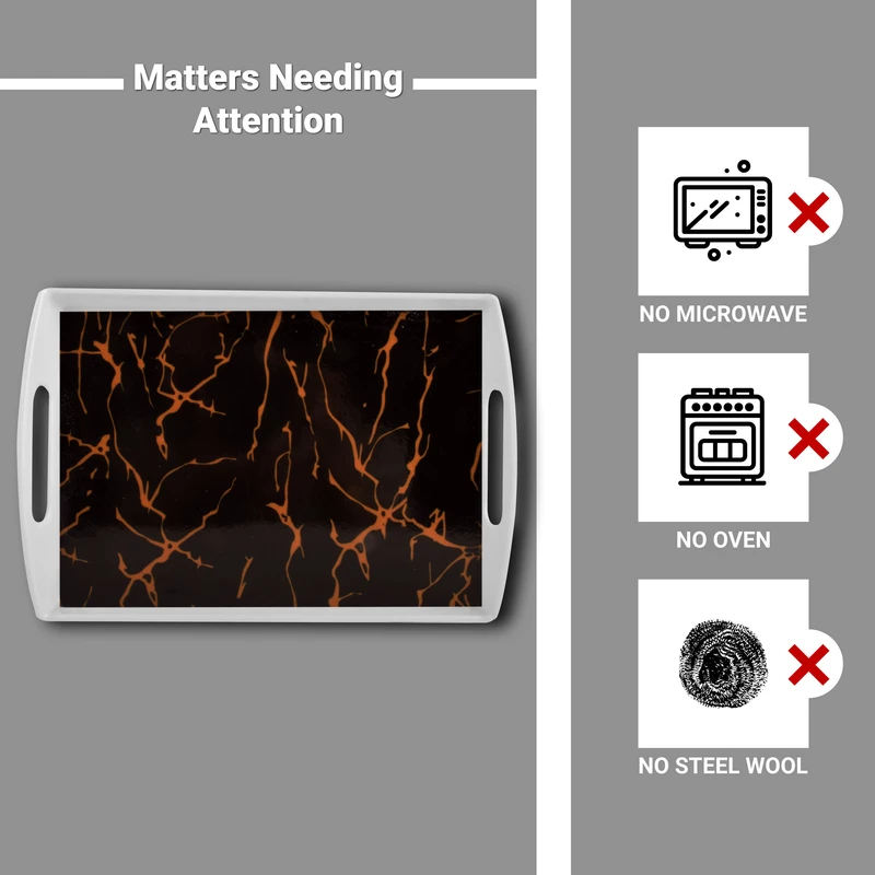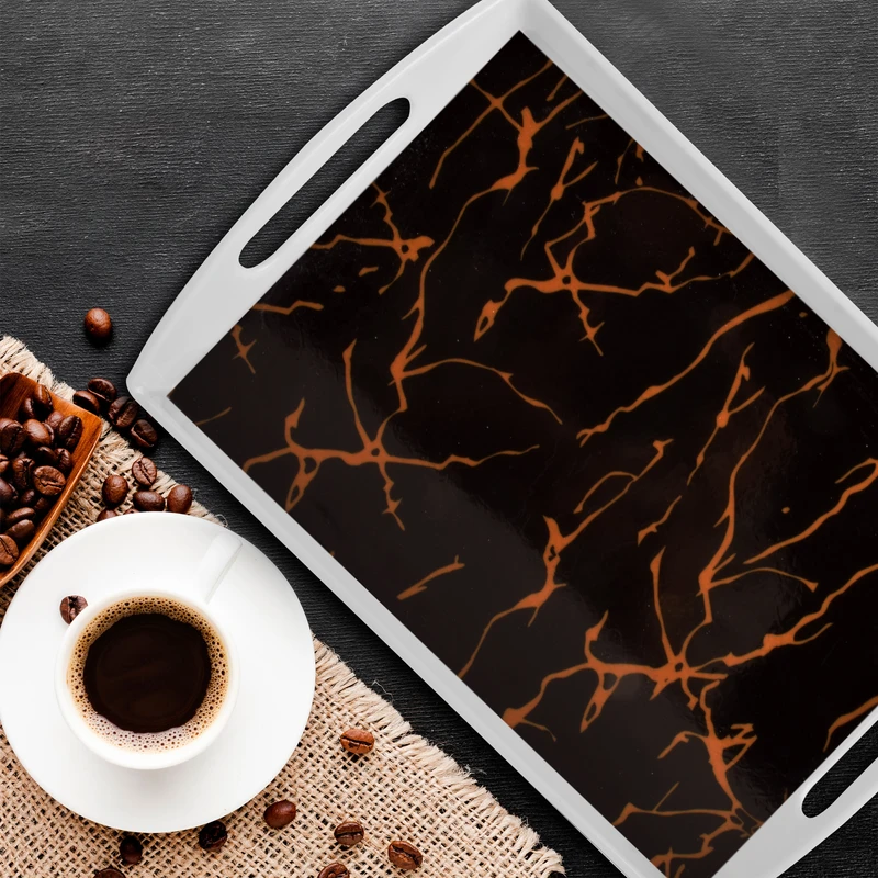 طرح مرمر در این سینی، صرفاً یک نقش تزئینی نیست. خطوط نامنظم و طبیعی آن، حس عمق و بافت ایجاد میکند چیزی شبیه سنگ واقعی، اما بدون سنگینی یا سردی. همین باعث میشود سینی هم در فضاهای مدرن جای خودش را پیدا کند و هم کنار دکورهای کلاسیک ناهماهنگ نباشد.